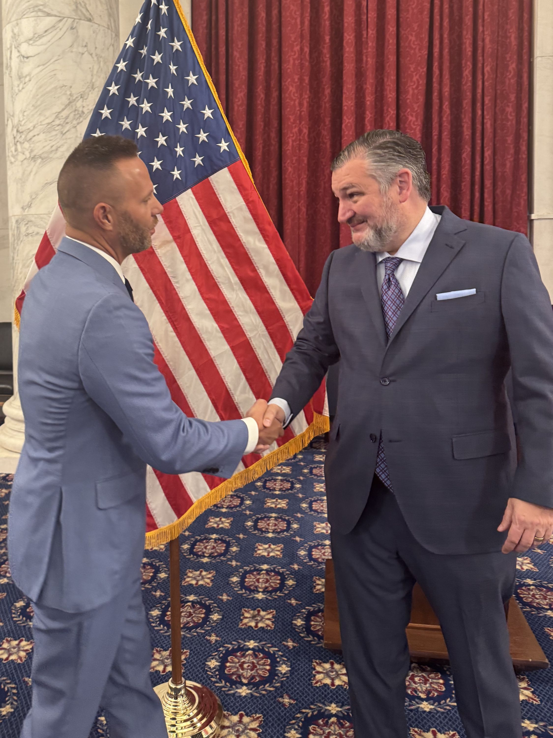 Joey Evans of TNW Corporation (left) met Texas Senator Ted Cruz during a trip to Washington, D.C. with members of the Texas Short Line Railroad Association (TSLRRA) to advocate for the 45G short line tax credit modernization bill. TGB Group’s Rebecca Murphy and Brownsville & Rio Grande International Railway’s Shariff Gonnella also participated.